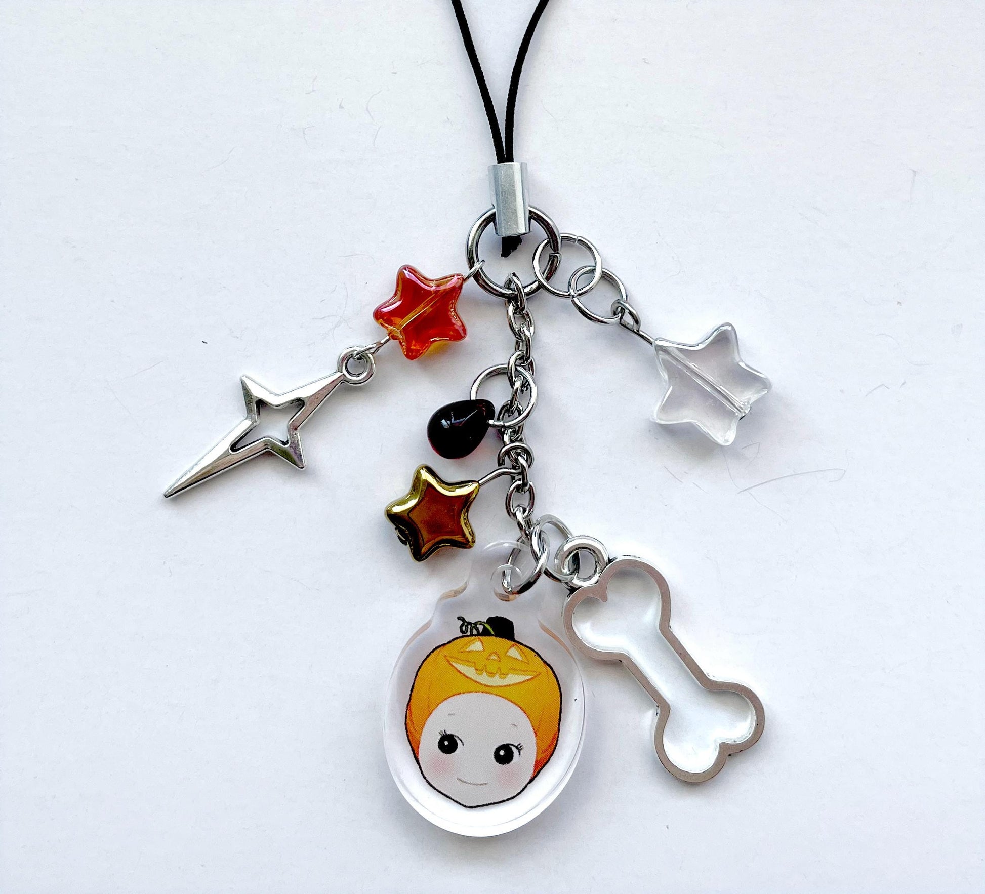 ★3 glass star beads, 1 red glass blood droplet bead, 1 metal bone charm, 1 metal sparkle charm