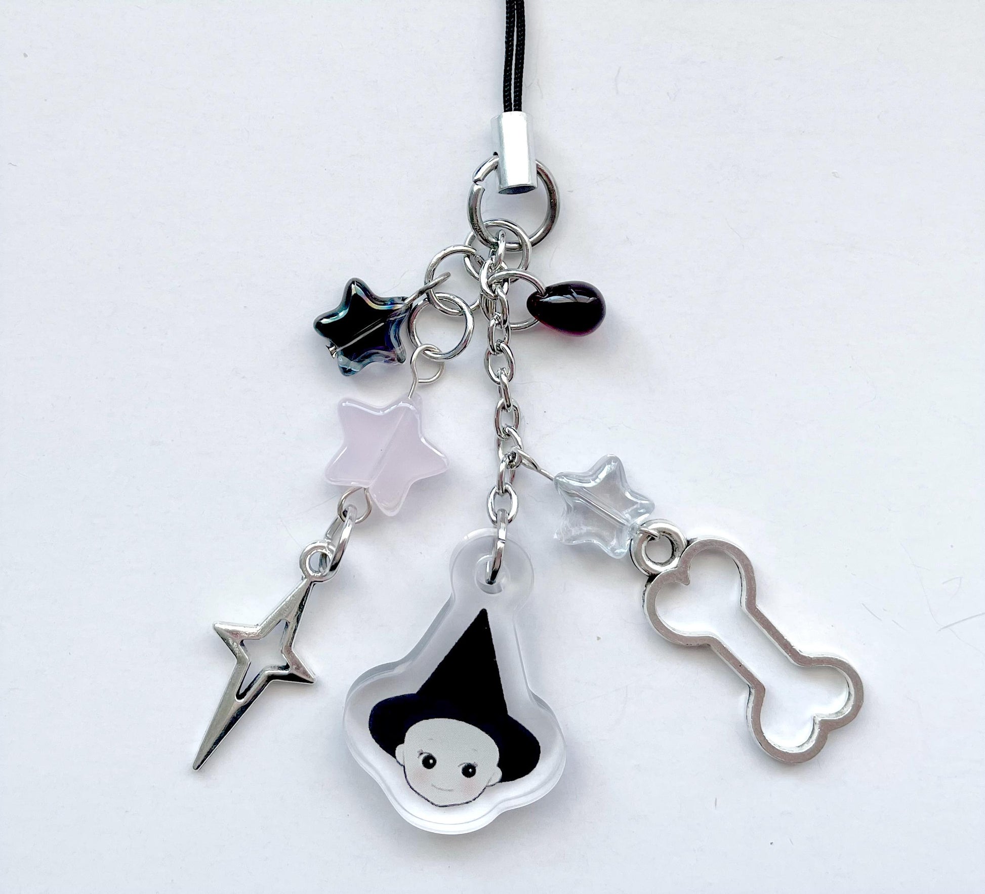 ★3 glass star beads, 1 red glass blood droplet bead, 1 metal bone charm, 1 metal sparkle charm